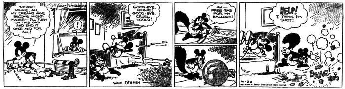วันถัดไปมิกกี้ก็เปลี่ยนวิธีฆ่าตัวตายใหม่อีก คราวนี้หันไปรมก๊าซในบ้านของเขา และล้มตัวลงนอนบนเตียงนอนหลับเพื่อรอหมดลมหายใจจะได้หลับตลอดกาล “มินนี่ ลาก่อน! โลกนี้ช่างโหดร้ายเหลือเกิน” อย่างไรก็ตามพอดีมีกระรอกตัวหนึ่งแอบเข้ามาในห้อง และพยายามอัดก๊าซใส่ลูกโป่งสวรรค์ และอัดมากไปจนลูกโป่งระเบิดออก และลูกโป่งระเบิดออก มิกกี้ เมาส์เลยตกใจตื่นเพราะนึกว่าถูกยิง จนหมดอารมณ์ฆ่าตัวตายอีก