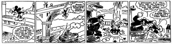 วันรุ่งขึ้นมิกกี้ เมาส์ก็พยายามฆ่าตัวตายอีก ด้วยการกระโดดจากสะพานสูง สู่แม่น้ำเบื้องล่าง แต่พอดีเวลานั้นมีเรือขนาดเล็กแล่นผ่านมาพอดี และมิกกี้ เมาส์จึงตกมายังพื้นเรือทำให้ไม่ตาย และถูกกัปตันเรือจับโยนลงน้ำ ที่น่าตลกคือมิกกี้ เมาส์ได้ขอร้องกัปตันว่า “อย่าโยนผมน่ะ ผมว่ายน้ำไม่เป็น ไม่งั้นจมน้ำแน่!”