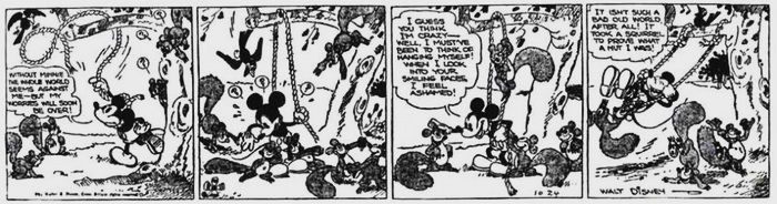 ในที่สุดมิกกี้ เมาส์ก็โยนบ่วงคล้องกิ่งไม้เพื่อที่จะแขวนคอตนเอง หากแต่ระหว่างนั้นเขาก็ถูกล้อมรอบด้วยกระรอกขี้เล่นและมีความสุข มิกกี้ เมาส์จึงคิดได้และกล่าวว่า “ฉันคิดว่าฉันกำลังบ้า อ่า ฉันคิดที่จะแขวนคอตัวเอง! ฉันรู้สึกละอายเหลือเกินเมื่อเห็นใบหน้าเปื้อนยิ้มของพวกนาย! โลกนี้มันไม่ได้โหดร้ายขนาดนั้น! ต้องให้กระรอกพวกนี้ทำให้ฉันรู้ว่าตัวเองบ้าขนาดไหน!"